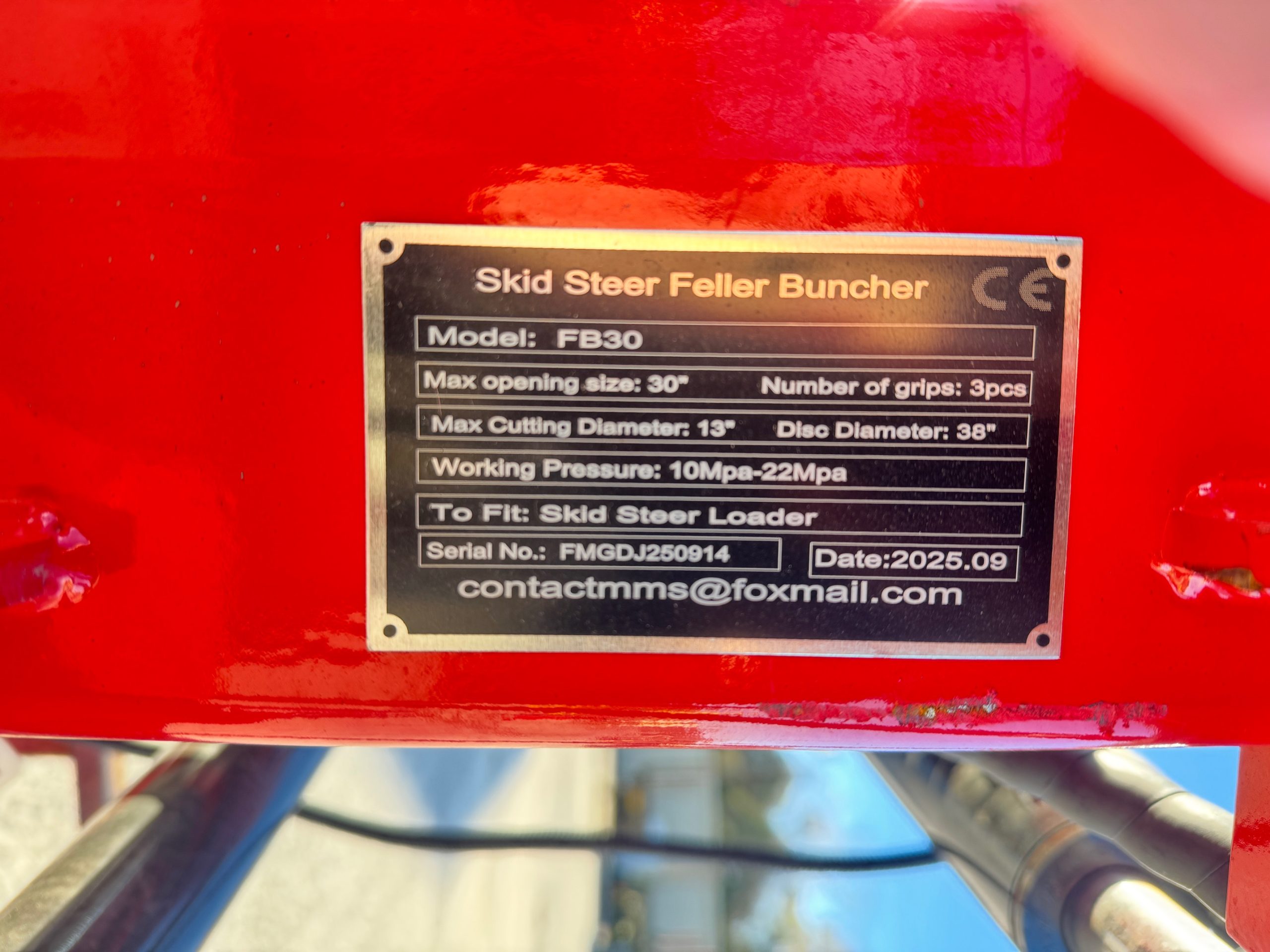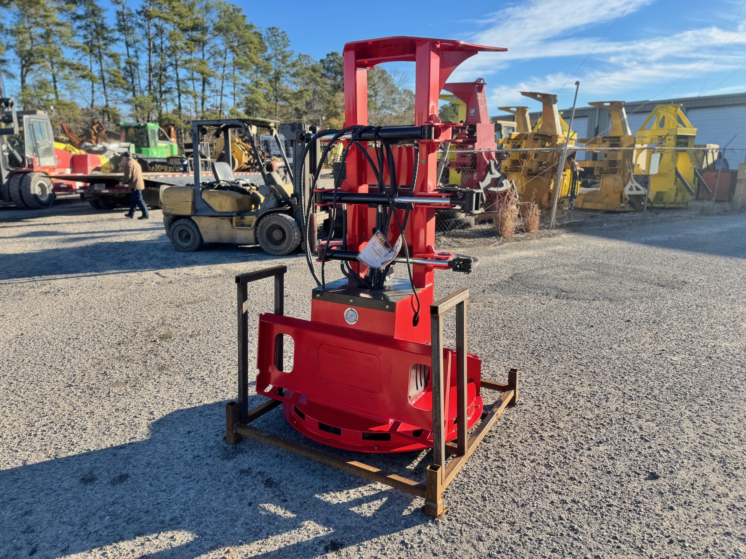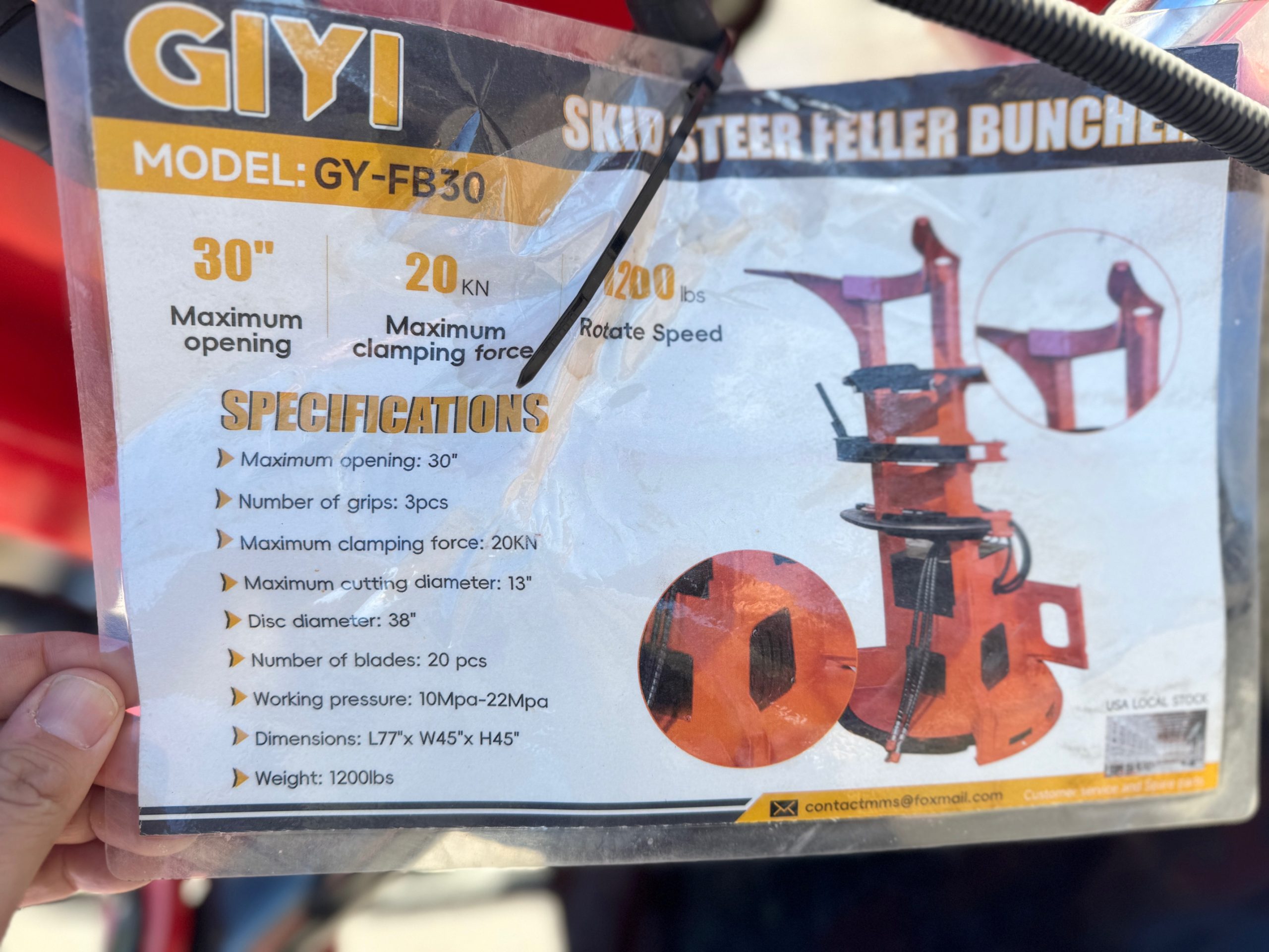 New GIYI FB30 skid steer feller buncher saw head. It has a max opening of 30 inches. Max tree cutting diameter of 13 inches. Disc diameter of 38 inches. Great for any small land clearing or tree removal jobs.