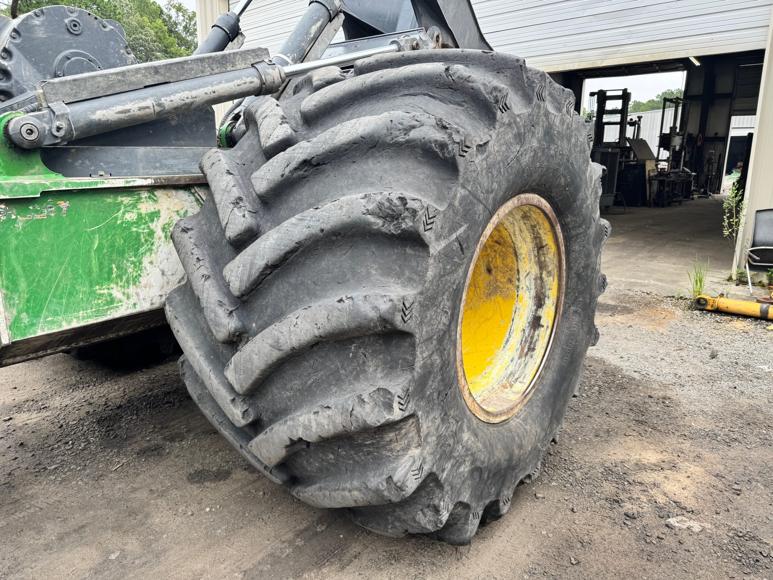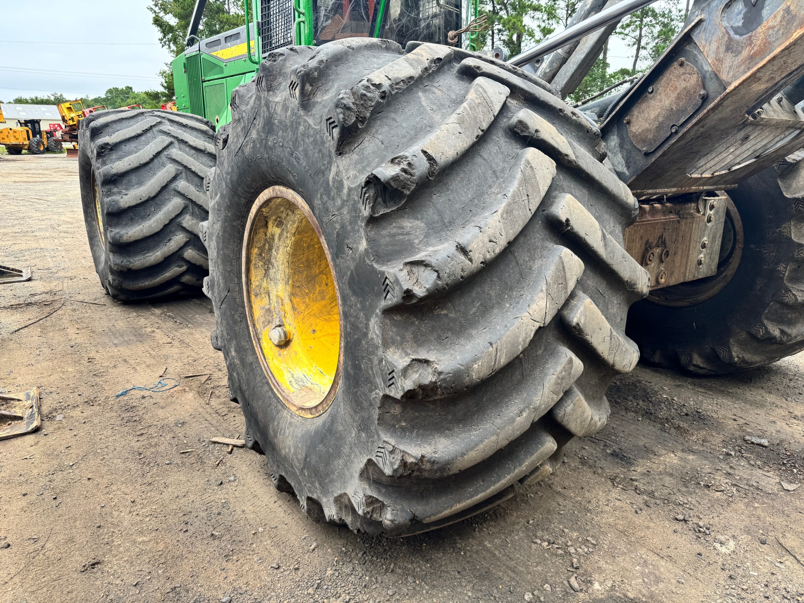 JD 748L-2 SWEDA RIMS. These came off a Deere 748L-2. Tires all hold air. The back tires are in good condition. The front tires have less tread. One has a spot that is detailed in the pictures. Please call 843-761-8220 for availability.